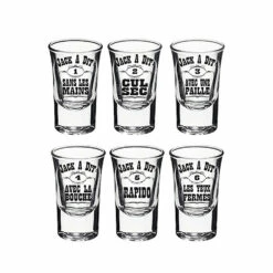 Ludique et festif, prenez un verre au hasard et consommez le de la manière indiquée parmi les six inscriptions sur chaque verre : Sans les mains, Cul sec, avec une paille, avec la bouche, rapido et les yeux fermés. De quoi déclencher avec vos amis, en consommant de l’alcool avec modération bien entendu. Le design de l’inscription sur les shooters n’est pas sans rappeler le style de la célèbre marque de spiritueux Jack Daniel’s. Jack a dit… buvez !