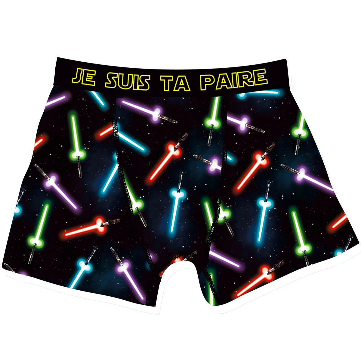 Directement , ce caleçon humoristique est une de la célèbre réplique de Dark Vador : « Je suis ton père ». La fameuse réplique devient : « Je suis ta paire » et le sabre laser qui compose le motif de ce caleçon prend une forme évoquant les attributs masculin sur fond étoilé. Ce est souple et s’adapte aux formes des messieurs et ce quelque soit la taille du « sabre laser » à l’intérieur.