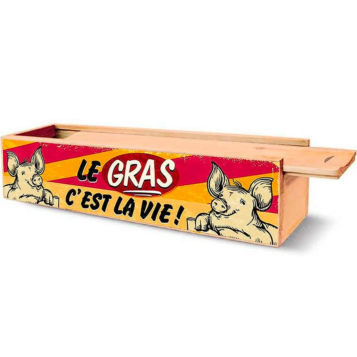 A l’image d’un plumier d’écolier, le coffret en bois est équipé d’un couvercle coulissant et d’une grille d’aération pour ventiler avec soin votre merveille charcutière et préserver ainsi toutes ses qualités gustatives. Un couteau dont l’étui est fixé sur le côté est livré avec le coffret. L’inscription « Le gras c’est la vie ! » finit cet ensemble de dégustation pour saucisson avec humour. La est un pour qui sait apprécier les spécialités gastronomiques à base de charcuterie et… de gras.