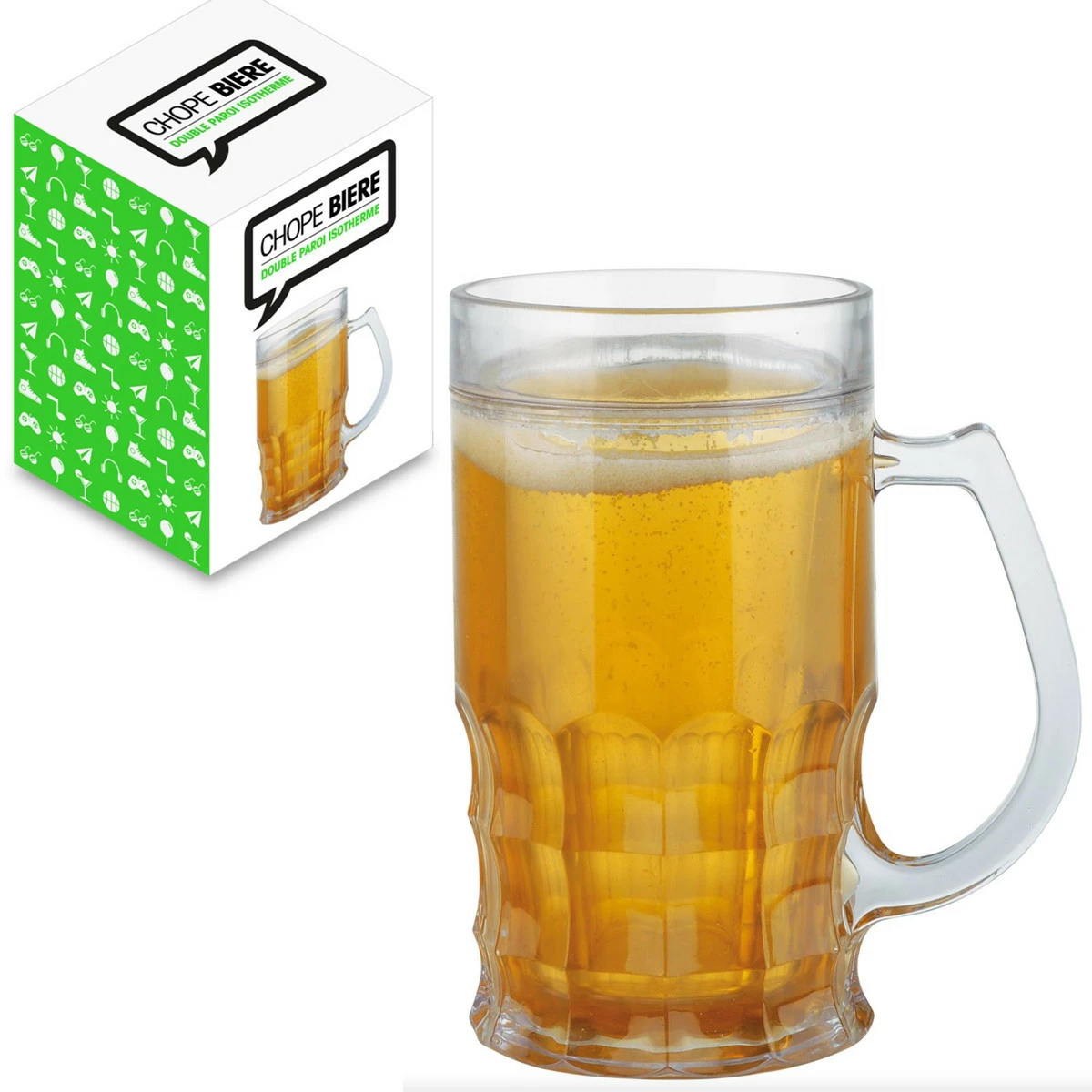Le liquide de couleur prisonnier dans la double paroi de la chope a pour objectif de rafraîchir la bière que vous y verserez. Placez la chope au réfrigérateur pendant 2 à 4 heures afin de la rafraîchir et de créer un manteau de fraîcheur pour votre boisson. Réutilisable à volonté ! la double paroi de la isolera votre boisson et la maintiendra fraîche pendant longtemps !