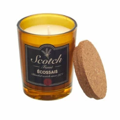 - bougies en cire dans pots en verre façon bouteille de whisky avec couvercle en liège,