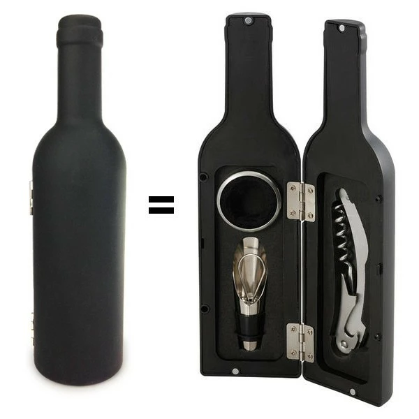 Un joli coffret en forme de bouteille  qui abrite un tire-bouchon, un bec verseur et un col Ă bouteille anti goutte !Â