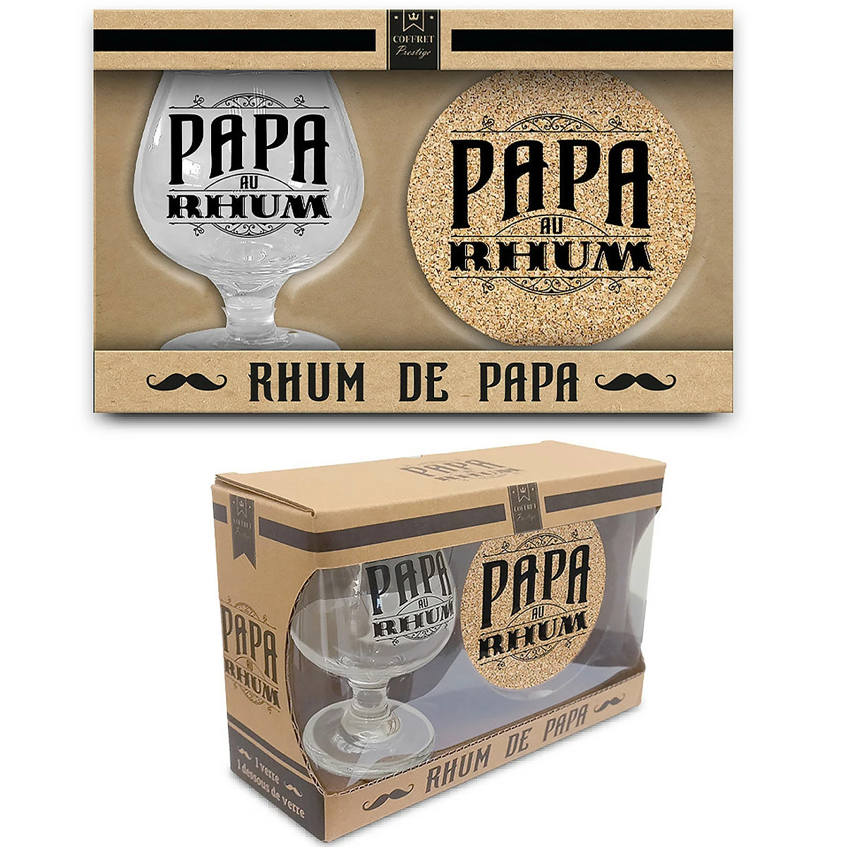Comprenant un verre ballon à Rhum et un dessous de verre assorti en liège, ce coffret est le cadeau qui fera sourire votre père surtout s’il est amateur de rhum. L’inscription humoristique « Papa au rhum » est présente sur le verre et sur le dessous de verre. Une Idée cadeau à offrir sans modération à votre papa qui apprécie ces alcools puissants (avec modération) !