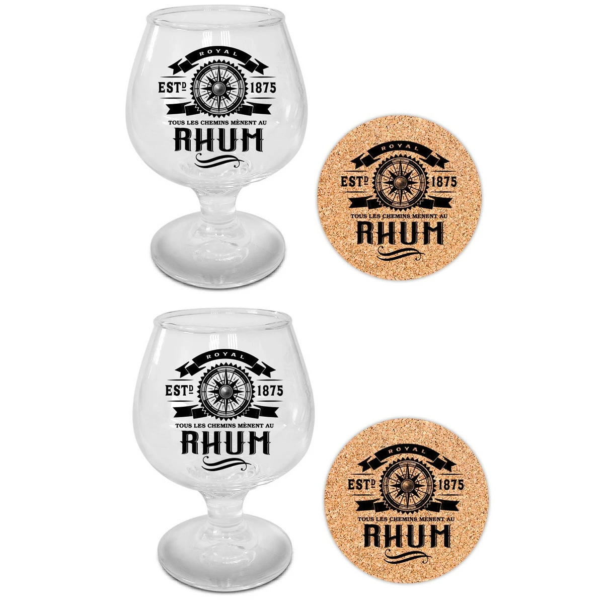 Comprenant deux verres ballon à Rhum et de deux dessous de verres assortis en liège, ce coffret ne laissera personne indifférent. Idée cadeau à offrir sans modération à quelqu’un qui apprécie ces alcools puissants (avec modération) !