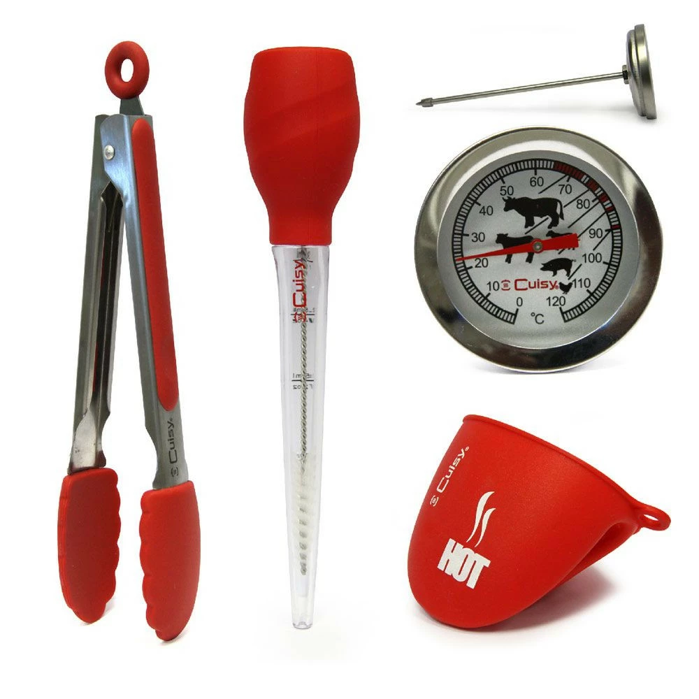 - Contient une manique, un thermomètre, une pince et une poire à jus avec son écouvillon pour la nettoyer,