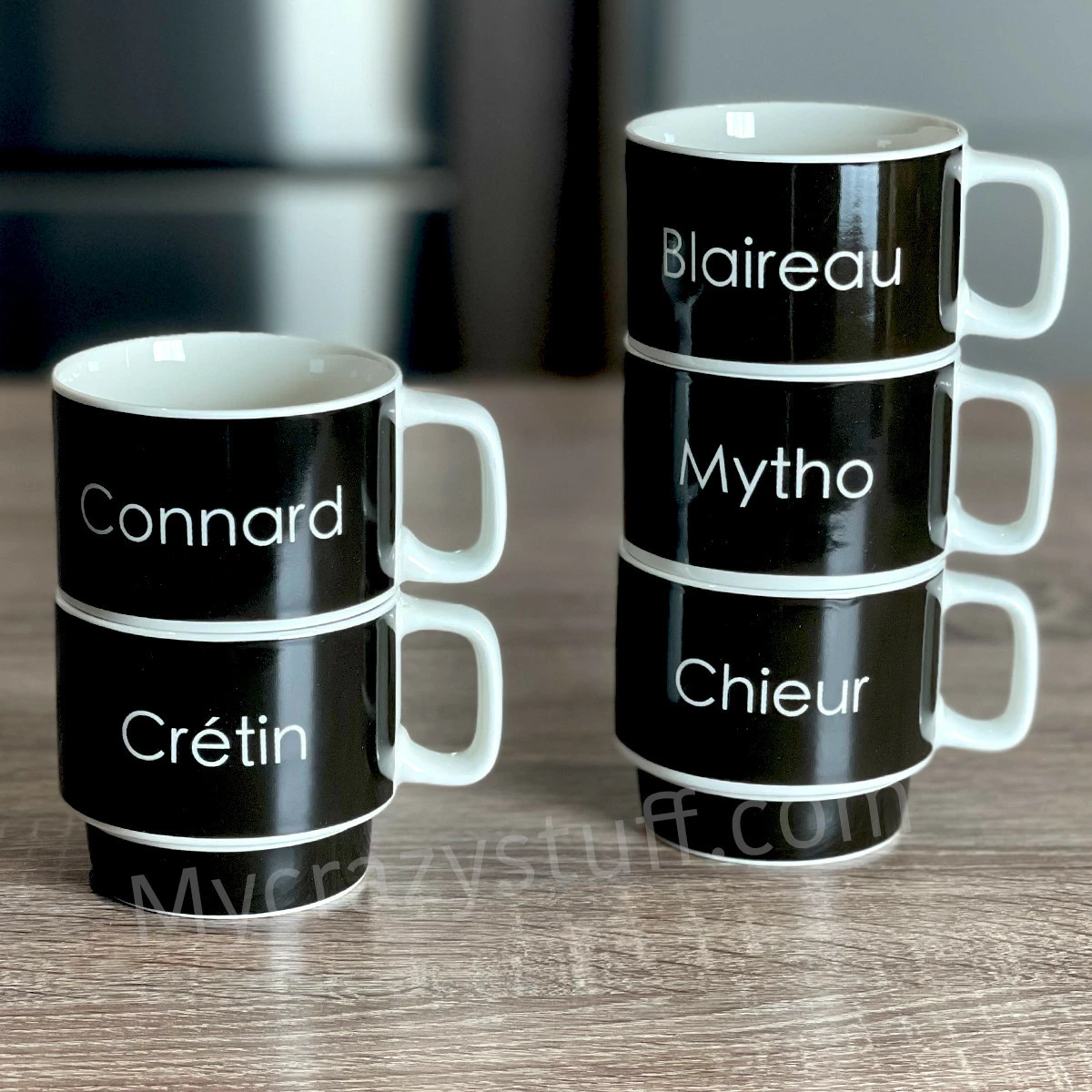 « Chieur », « Blaireau », « Mytho », « Crétin », « Connard » ! Messieurs vous voici habillés pour l’hiver avec ce lot de tasses insolites et humoristiques. Un peu de second degré ou d’autodérision ne nuisent pas dans ce monde de brutes et cet ensemble de donne le ton avec humour. Elégantes avec leur habillage noir du plus bel effet, le comprend 5 tasses de contenance généreuse (20cl) qui s’empileront avec une facilité déconcertante. Reste à savoir lequel d’entre vous récoltera la tasse la moins flatteuse à la pause café, ce qui entre ne devrait poser aucun problème au « blaireau » de service ou autre sombre « connard ». Evidemment, utiliser ce genre de tasse nécessite un minimum d’autodérision, d’ouverture d’esprit et d’humour, en somme tout ce que ne possède pas un « coincé du bulbe ».