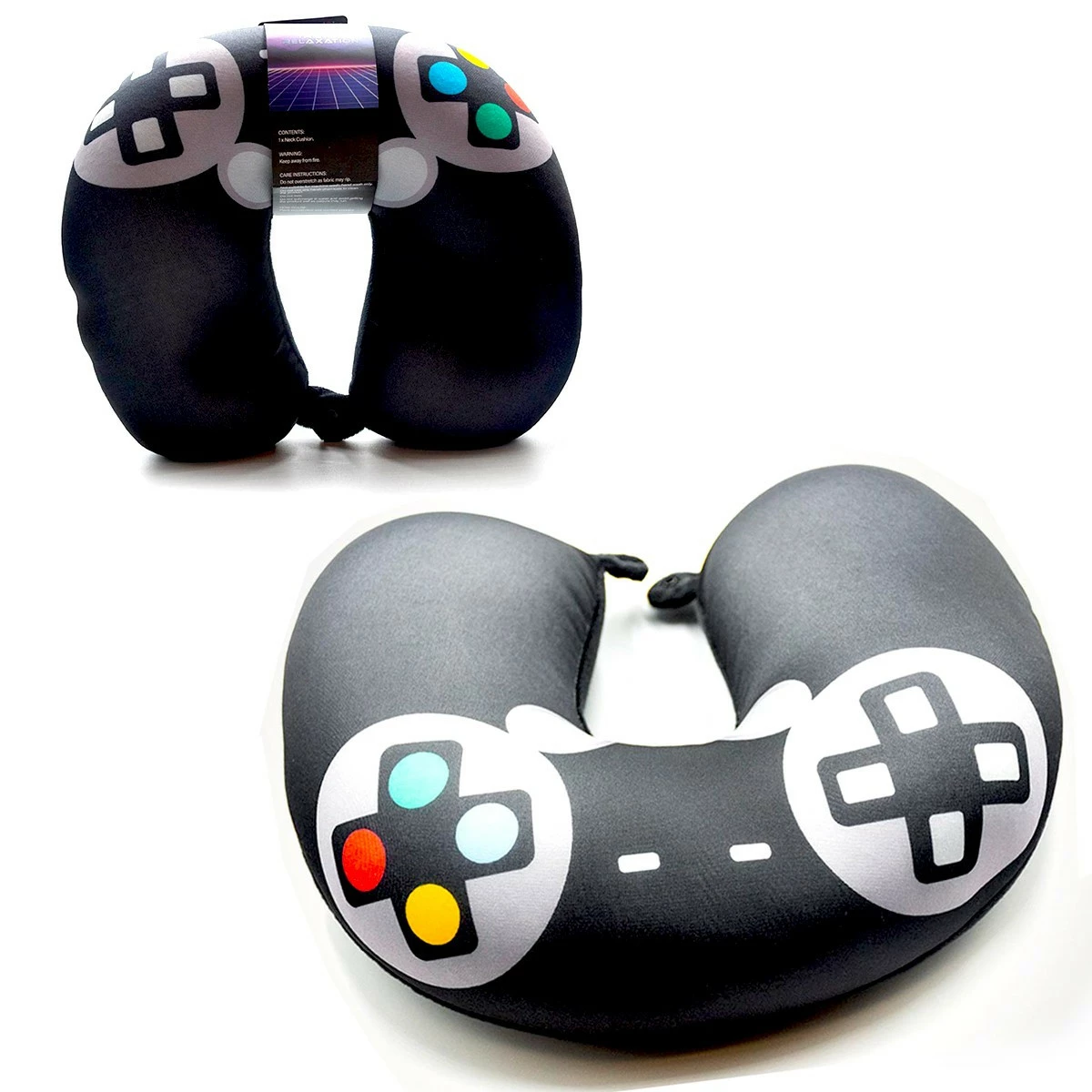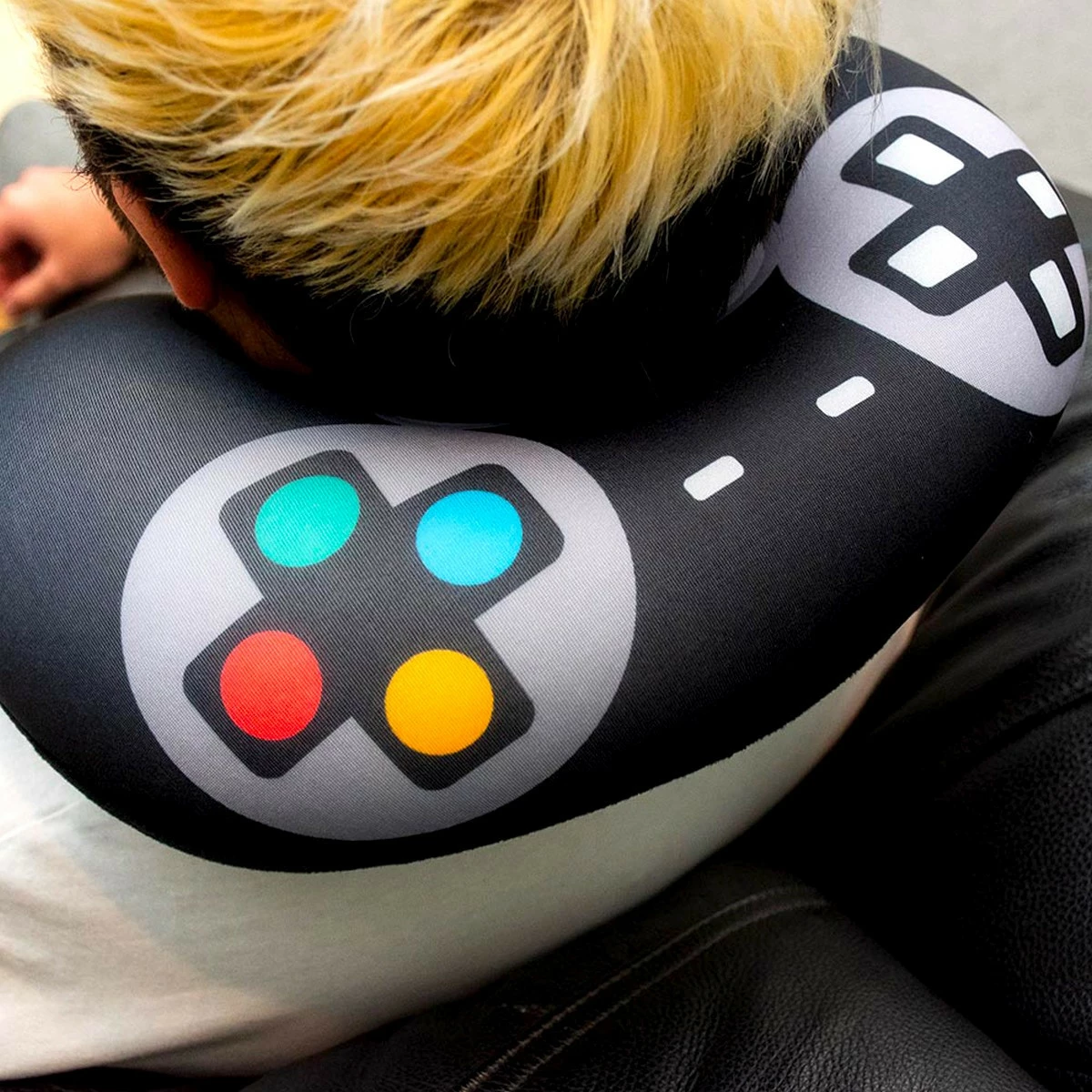 Ce drôle de coussin dont il empreinte presque la forme. Le motif est celui des boutons de la manette sur fond noir. La structure du est en micro-billes et lycra de sorte qu’il s’adapte parfaitement à chaque morphologie pour soutenir au plus près le « petit cou » du joueur (il ne faudrait quand même pas qu’il se blesse en jouant à la console !). Ainsi, le coussin englobe parfaitement le cou du joueur qui peut se détendre et se concentrer pleinement. Un bouton pression permet le maintien en place, évitant ainsi d’avoir à lâcher la manette pour le remettre lors d’un éventuel sursaut. Vos geeks préférés vous diront merci et leurs cervicales aussi !