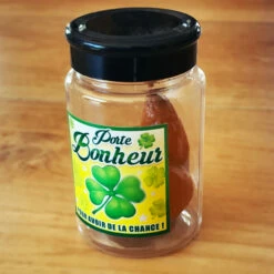Mais au fait, d’où vient ce rituel singulier ? Il nous vient du monde du spectacle au XIX ème siècle. A cette époque, le public se déplaçait en calèche tirée par des chevaux. Lorsqu’ils s’arrêtaient devant le théâtre pour aller voir une pièce, les chevaux en profitaient pour se soulager de quelques crottins. Plus la couche de crottin était importante devant le théâtre, plus cela signifiait que les gens se déplaçaient pour venir voir la pièce et par conséquent que son succès était important. Les acteurs superstitieux s’interdisaient de se souhaiter « bonne chance », pensant que cela portait malheur. Ils préféraient simplement se souhaiter « beaucoup de « merde » devant le théâtre ». Depuis, cette expression est restée, voilà, vous savez tout sur ce petit rituel bienveillant. Notre est donc la parfaite illustration de cette expression. Un petit (et un peu crado). Le bocal renferme une petite crotte en plastique mou et collant avec laquelle vous pourrez vous amuser si vous le souhaitez. Bien sûr, cette petite crotte molle choquera les plus prudes, mais quelle satisfaction de la malaxer ou de la lancer sur une surface vitrée ! quel amusement de constater la stupéfaction de vos collègues vous voyant jouer avec cette matière sans avoir été préalablement « mis au parfum » qu’il s’agit d’un porte-bonheur !