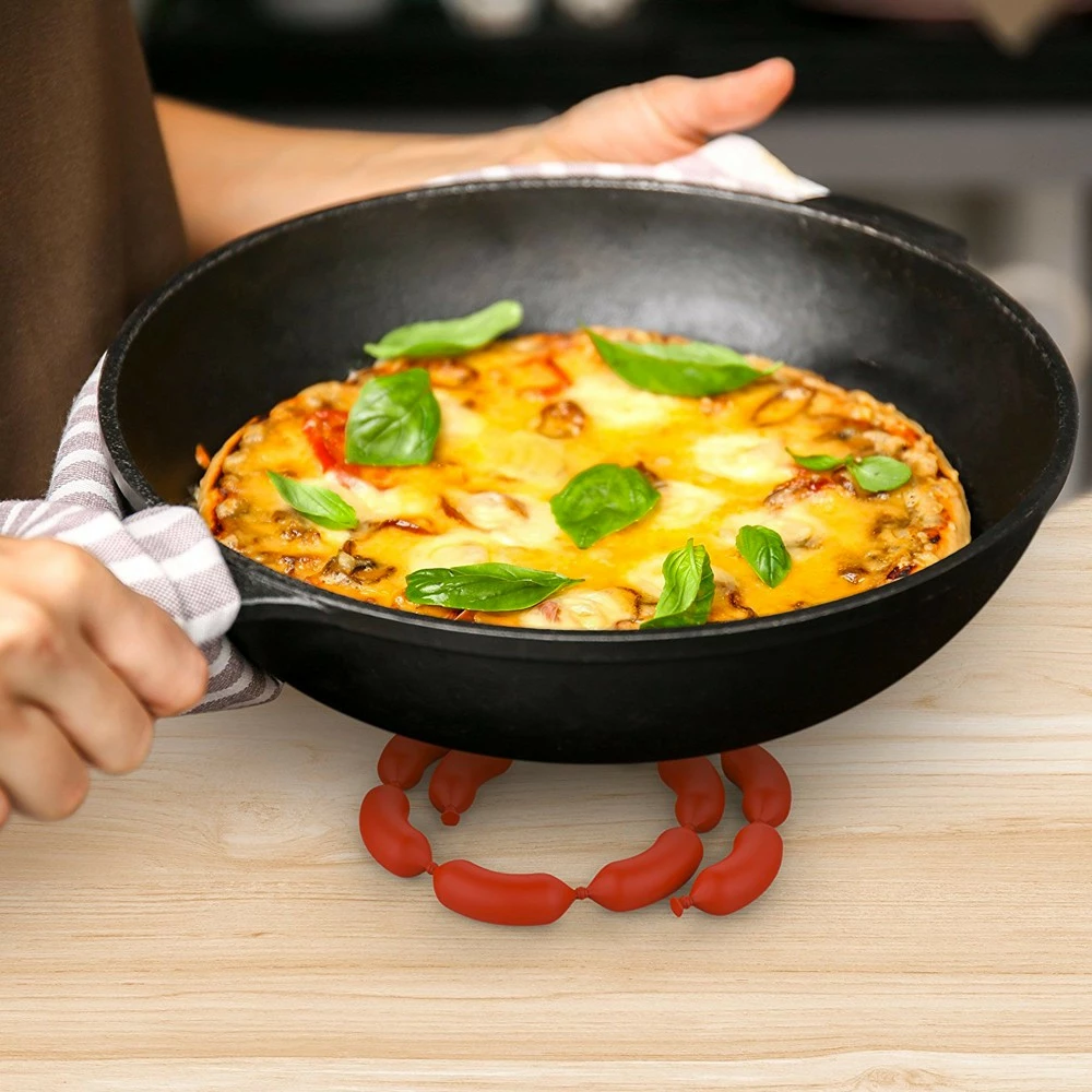 Rien de mieux qu’un chapelet de saucisses pour poser un plat chaud sur votre mobilier ! Du moins, pas n’importe quel chapelet de saucisses, seul le en silicone sera assez résistant au poids et à la chaleur de votre marmite.