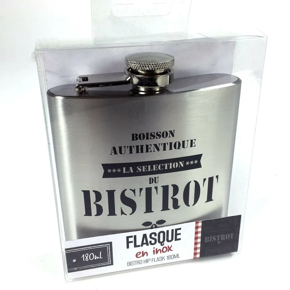 Toujours sur vous en cas de « petite soif » voici la flasque en inox « Sélection du bistrot ». La flasque est un moyen discret de transporter de l’alcool (à consommer avec modération).
