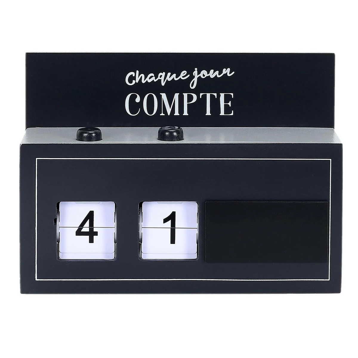 Cet objet original vous permettra de tenir Ă jour le dĂ©compte pour l’Ă©vènement de votre choix : vacances, naissance, anniversaire, dĂ©part en voyage, date d’un examen… Chaque jour compte ! Il vous suffit d’inscrire l’Ă©vènement Ă la craie sur le panneau rĂ©servĂ© et une fois par jour appuyez sur l’un des boutons qui fera changer le chiffre. Vous pourrez dĂ©compter jusqu’Ă 99 jours mais aussi semaines, mois ou heures, tout dĂ©pend de ce que vous inscrirez sur le panneau. Le design du est sobre et Ă©lĂ©gant, vous pourrez ainsi l’exposer Ă l’endroit de votre choix, un endroit oĂą vous pourrez le voir chaque jour.Â