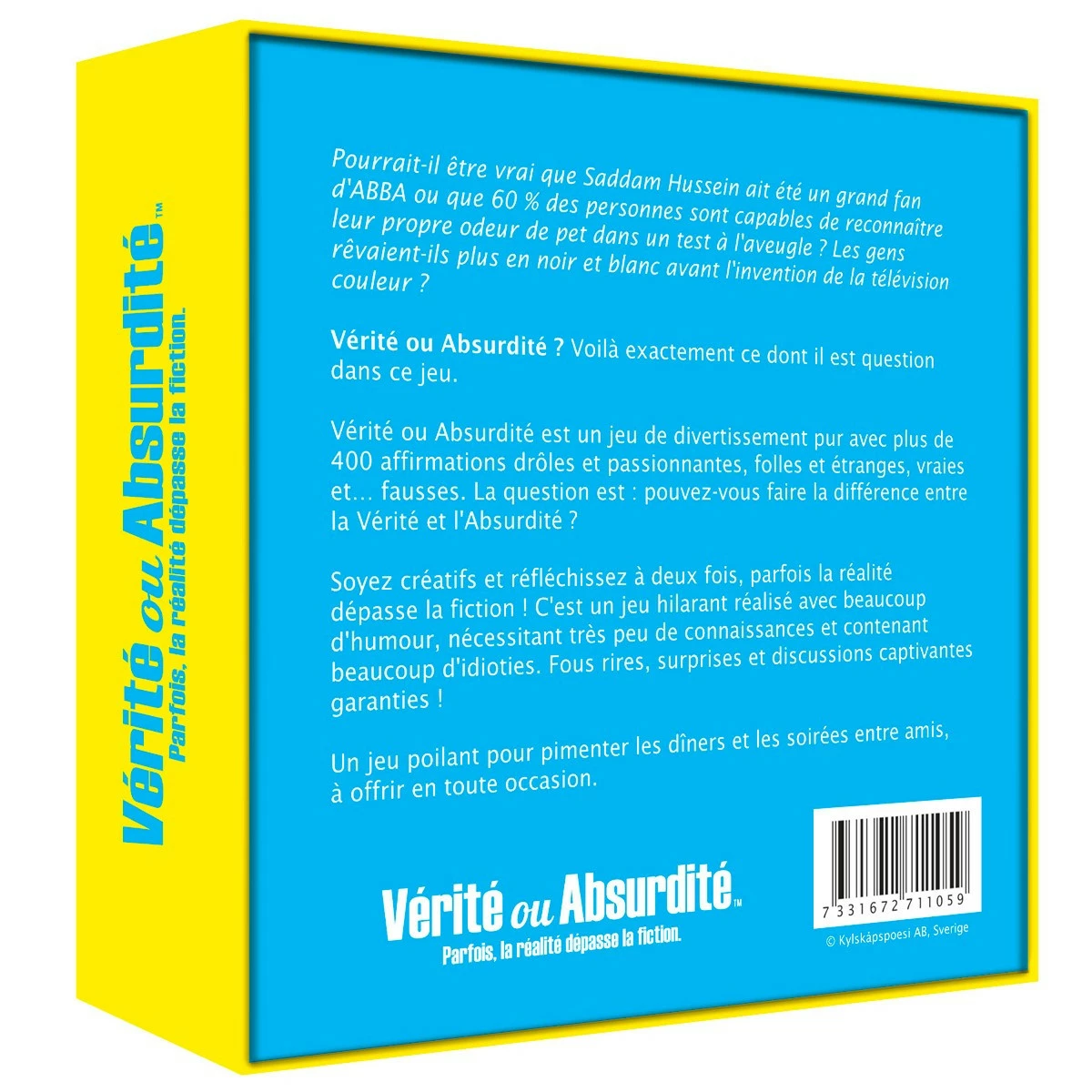 Le , c’est plus de 420 affirmations étranges, drôles et passionnantes dans lesquelles il vous faudra discerner la réalité de la fiction (et parfois la réalité dépasse la fiction !). Pourrait-il être vrai que Saddam Hussein ait été un grand fan d’Abba ? ou que 60% des personnes sont capables de reconnaître leur propre odeur de pet dans un test à l’aveugle ? Tel est le genre de questions auquel il faudra vous attendre lors d’une partie de. Un jeu poilant nécessitant très peu de connaissances qui pimentera joyeusement les dîners ou soirées entre amis.