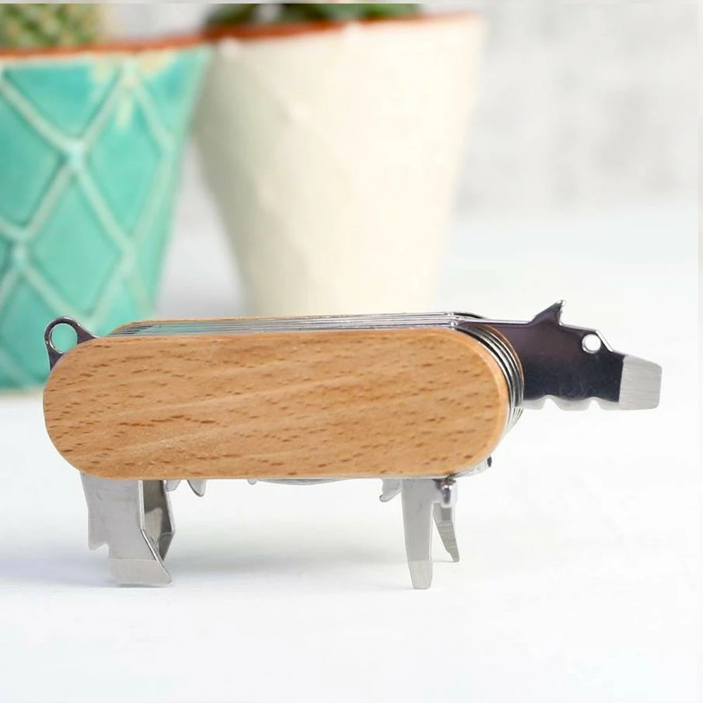 Une bouteille à décapsuler ? demandez à votre rhinocéros de poche. Quelque chose à limer ? utilisez votre lama. Un fil à dénuder ? munissez-vous de votre chien ! Cet objet précieux et utile, au format idéal pour votre poche, se pliera en 7 pour vous rendre service. Les jambes des animaux fournissent quant à elles des tournevis en tout genre, sans oublier une lame de canif. Le cadeau idéal pour un bricoleur baroudeur !