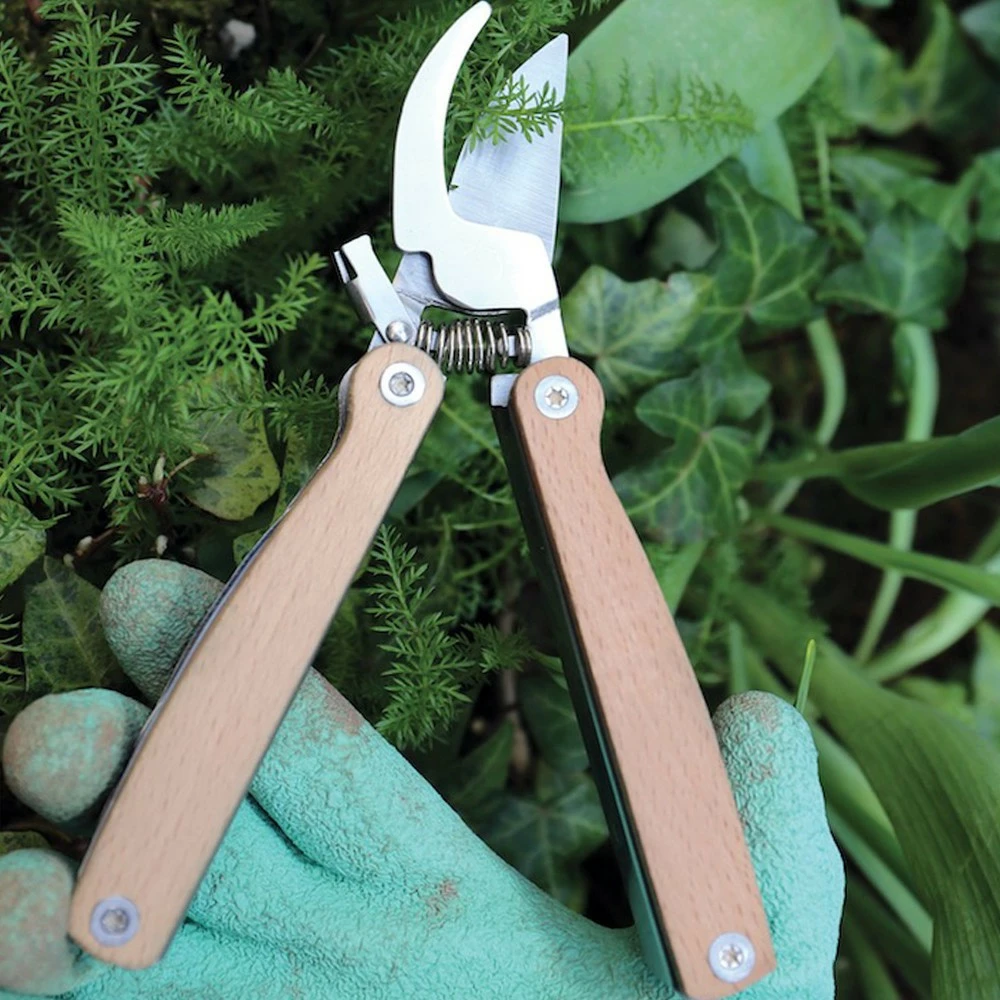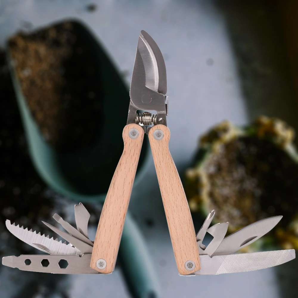 Véritable compagnon de travail indispensable dans votre jardin, le vous rendra moultes services ! Après avoir déplié les superbes poignées en hêtre massif vous aurez certes, un sécateur prêt à en découdre avec la moindre branche rebelle, mais vous profiterez également des qu’il renferme dans chaque manche. Sécateur, couteau, tournevis cruciforme, ouvre-boîte, règle, lime, tournevis plat tête large, clé anglaise de 4, 5 et 6 mm, poinçon, tournevis plat petite tête, décapsuleur et scie !! qui aurait cru que tous ces outils essentiels soient présents sur ce ? Un d’une grande utilité pour un jardinier amateur.