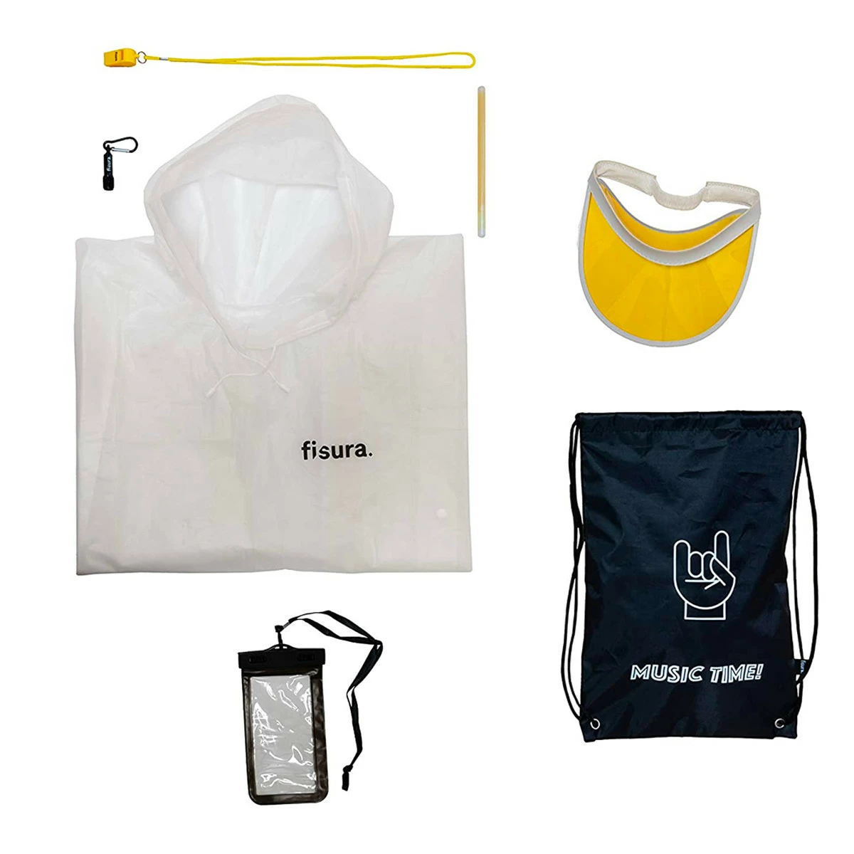 Emportez avec vous les 7 éléments essentiels qui vous rendront bien des services pendant votre festival ! Le comporte : une pochette étanche avec cordelette tour de cou pour protéger votre smartphone, votre monnaie ou vos papiers ; un sifflet pour mettre un peu d’ambiance et ménager votre souffle ; une mini lampe torche équipée d’un mousqueton ; un bâton luminescent à agiter en rythme avec la musique ; un poncho imperméable transparent au cas où la pluie se joindrait à la fête ; une casquette visière pour protéger vos yeux du soleil et un charmant petit sac à dos léger et pratique pour transporter l’ensemble ! Plus qu’à vous laisser charmer par la musique et savourer l’instant.