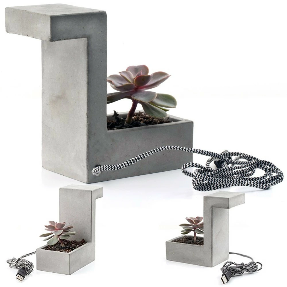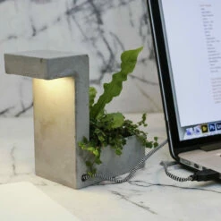 Véritable matériau qui permet toutes les audaces architecturales, devient de nos jours presqu’aussi noble que la pierre. Notre lampe de bureau est totalement réalisée en béton. On se surprendra à caresser sa et fraîche, à parcourir ses arêtes et ses du bouts des phalanges. Son pied est pourvu d’un petit bac dans lequel on pourra déposer trombones, gommes ou cartes de visite, mais nous vous recommandons d’y installer quelques petites n’ayant pas de gros besoins pour leur système racinaire. Quelques petits cailloux pour favoriser le drainage et un peu de terreau et le tour est joué ! vous obtiendrez une un objet design et utile. La son cordon tissé en coton et diffuse une lumière chaleureuse grâce à son idéal pour éclairer votre liste de choses à faire. Un cadeau parfait pour une personne sensible au design, aux matériaux et à l’originalité.