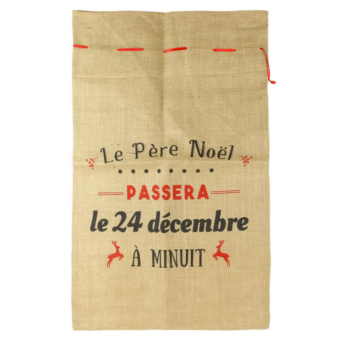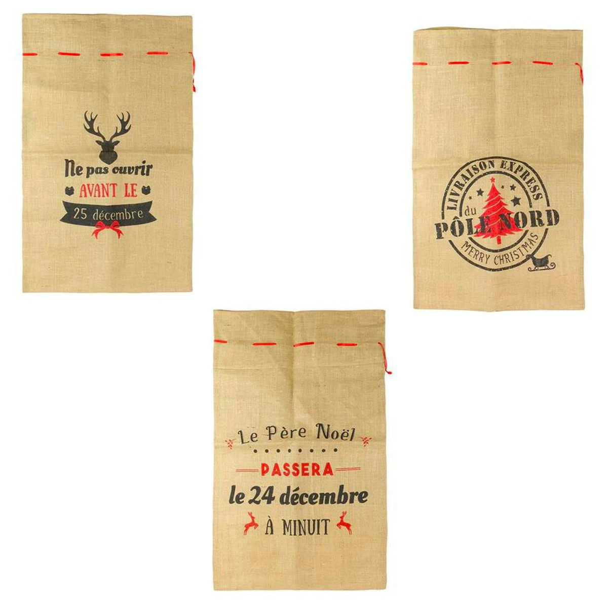 Ces trois grands sacs en toile de jute vous permettront des glisser vos cadeaux et des les mettre directement au pied du sapin. Mais patience ! on ne touche pas avant l’heure dite ! c’est d’ailleurs marqué en gros sur le sac. Le est composé de trois sacs différents comportant les inscriptions suivantes : « Ne pas ouvrir avant le 25 décembre », « Le père Noël passera le 24 décembre à minuit » et « Livraison Express du Pôle Nord ». Si vous craignez que des petits curieux n’ouvrent les sacs avant la date fatidique, rien ne vous empêche de les remplir avec autre chose ! Ces trois sacs donneront une et mettront des étoiles de bonheur dans les yeux des plus jeunes.