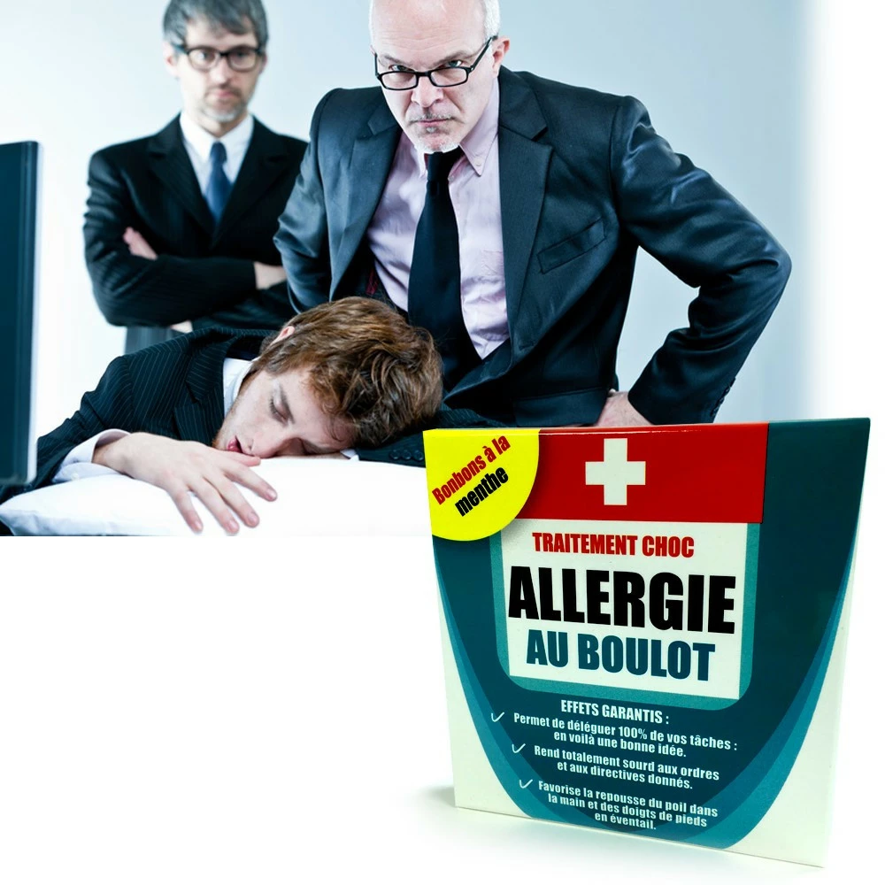 Le médicament Allergie au boulot vous permet de déléguer 100% de vos tâches et rend totalement sourd aux ordres et directives données. Un prise quotidienne le matin favorise la repousse du poil dans la main et déploie automatiquement vos doigts de pieds en éventail. Si vous souhaitez renforcer l’effet du traitement, une cure de 10 jours vous immunise contre la direction qui vous harcèle, la pointeuse qui vous nargue ou les 35 heures que vous souhaiteriez passer devant la télévision. Courage !