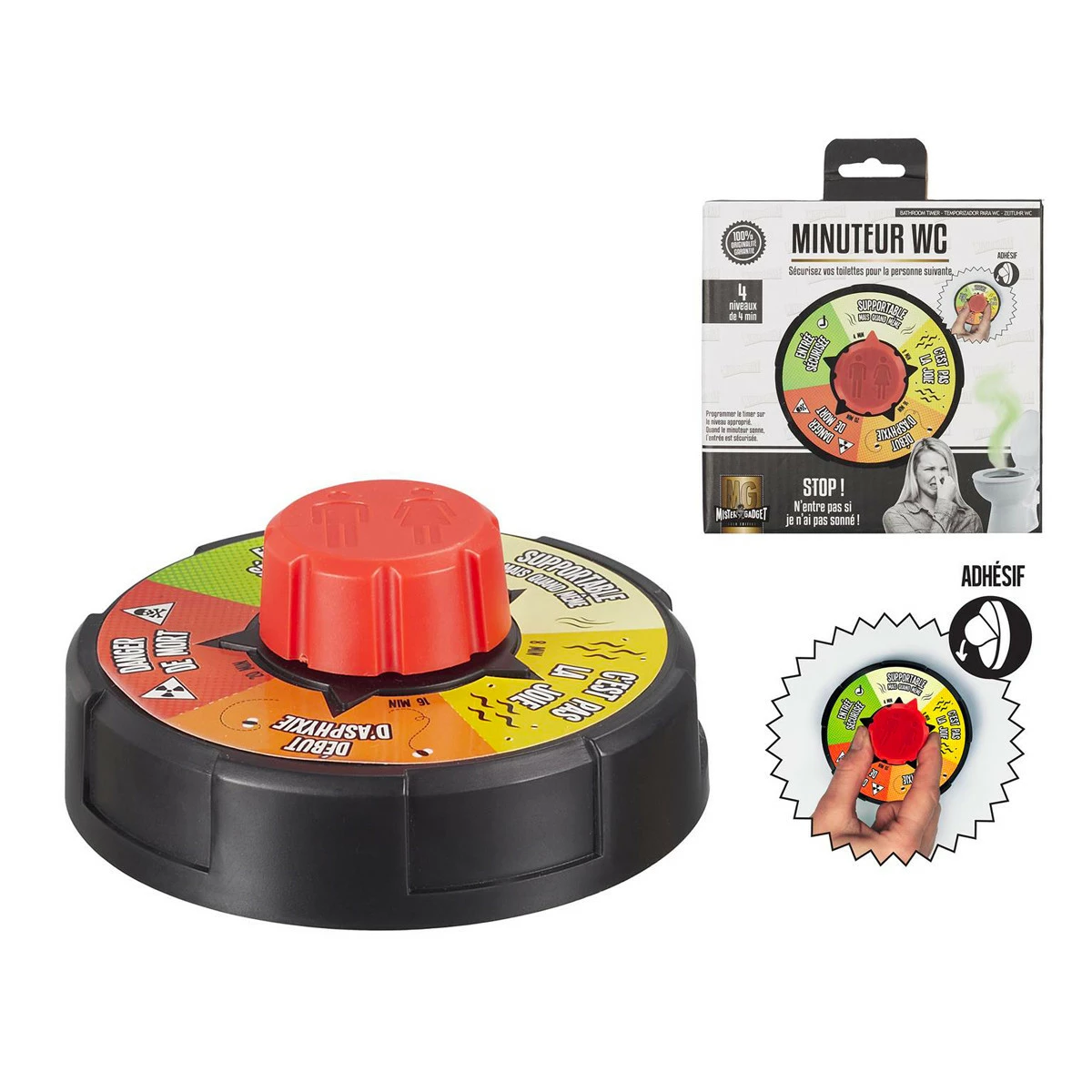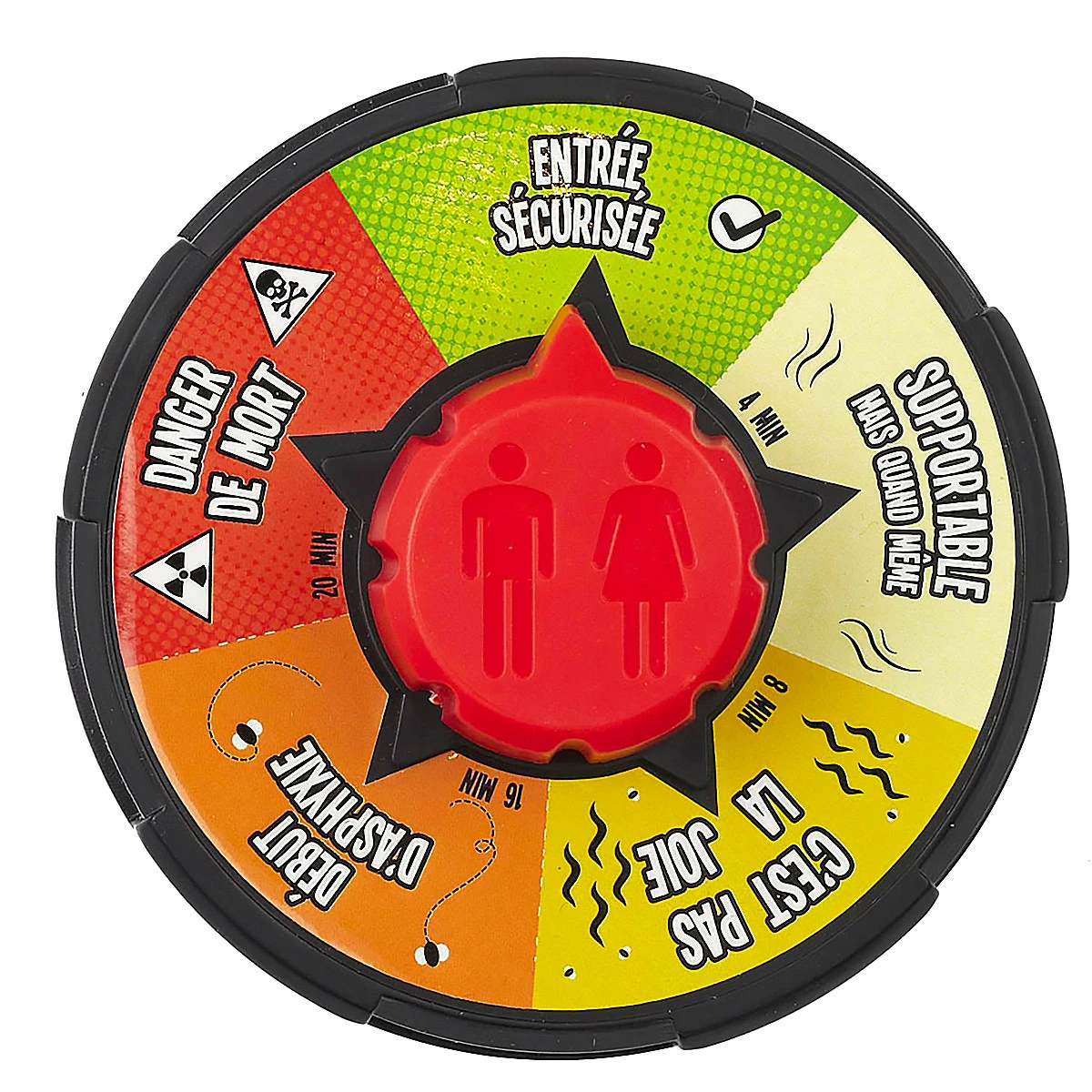 Le cassoulet de Tante Suzanne laisse des séquelles digestives ? à moins que la choucroute de Mamie Marcelle ne manifeste son intention de s’évader de votre corps ? Un peu de respect pour ceux qui passeront derrière vous aux toilettes ! le vous permettra de sécuriser la zone pour épargner l’odorat de la personne suivante. Une fois que vous avez terminé votre « prestation », tournez le minuteur sur l’un des niveaux recommandés en fonction du niveau d’intensité de votre performance (vous serez seul(e) juge). Il y a quatre niveaux croissants de danger, répartis chacun par tranche de 4 minutes : 1. Supportable, mais quand même (4 minutes) ; 2. C’est pas la joie (8 minutes) ; 3. Début d’asphyxie (16 minutes) ; 4. Danger de mort (20 minutes). Tant que le minuteur n’a pas sonné, il est vivement recommandé que personne ne pénètre dans la zone ou alors à ses propres risques et périls…