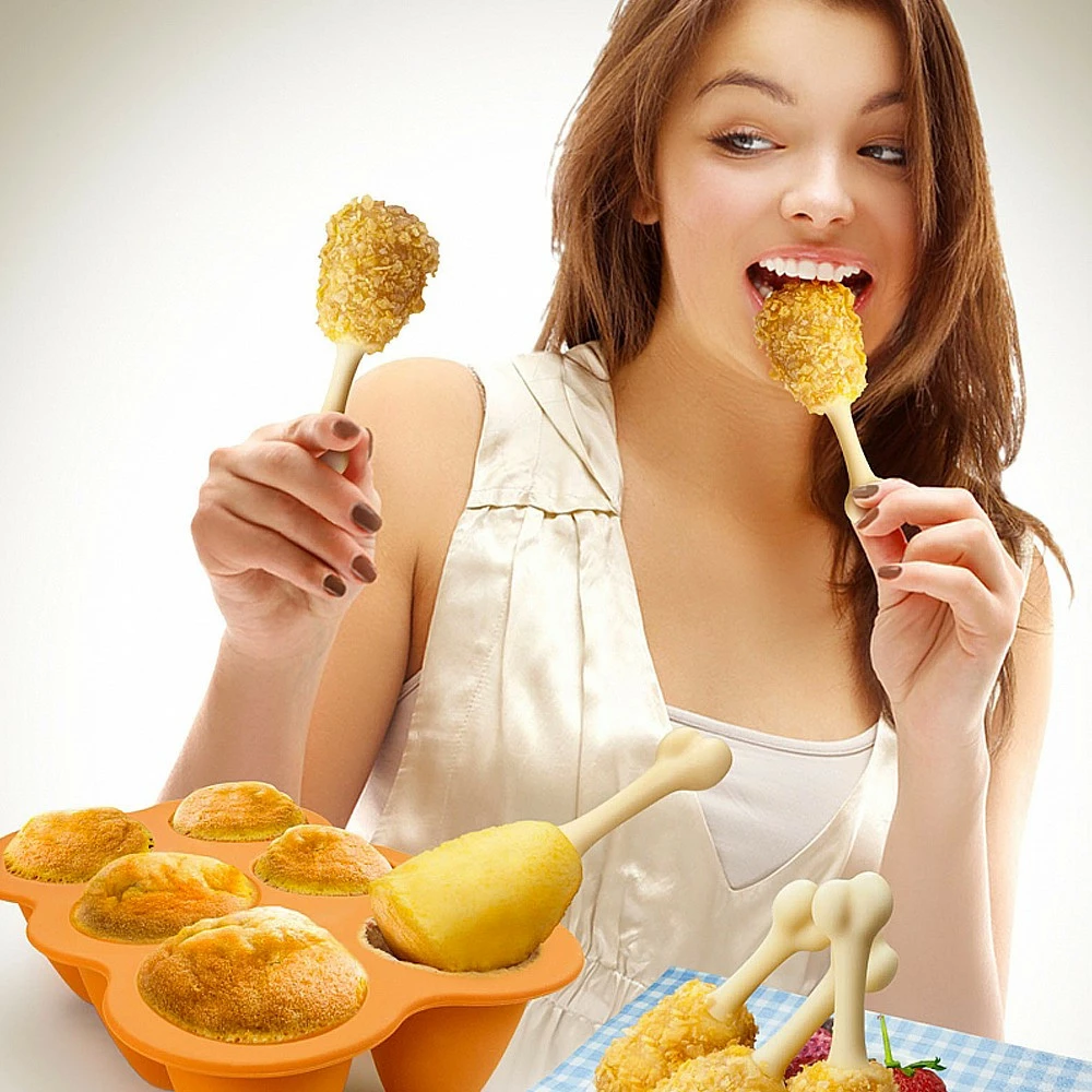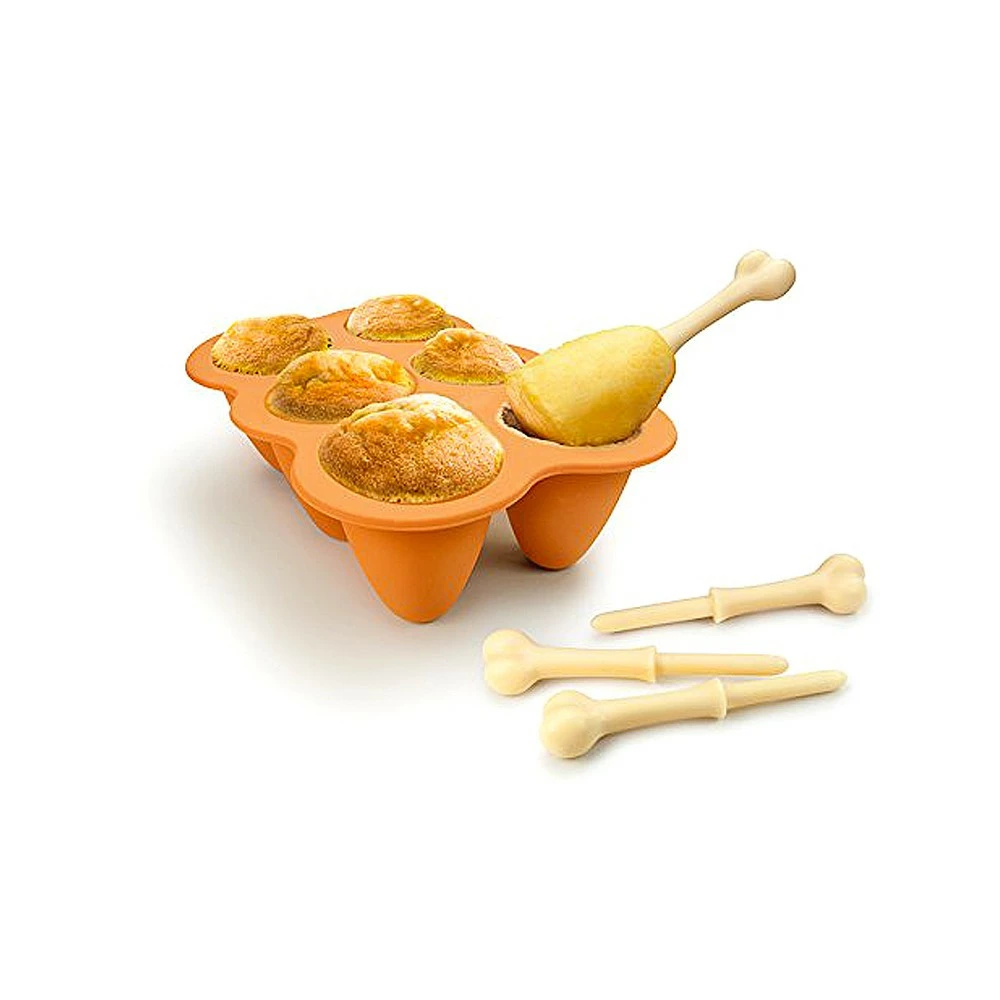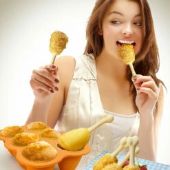 Le moule à pop-cakes pilons de poulet vous permettra de réaliser facilement . Une fois cuits, le démoulage est facile grâce au moule en silicone qui peut se plier facilement. Démoulez les petits cakes puis plantez les petits support en forme d’os de poulet dans les gâteaux. Pour plus de réalisme, vous pourrez broyer grossièrement quelques pétales de maïs (corn-flakes) dans un bol. Vous n’avez plus qu’à rouler les fausses cuisses de poulet dans cette chapelure après les avoir enduit de . L’illusion est saisissante ! de bien bons petits gâteaux pour grands carnivores !