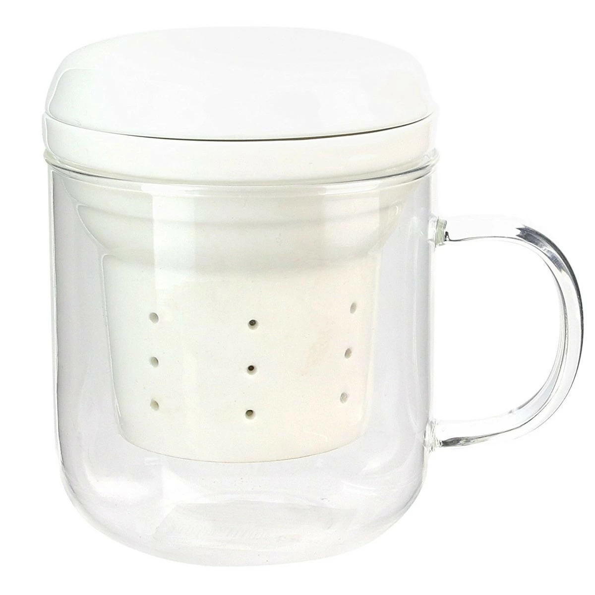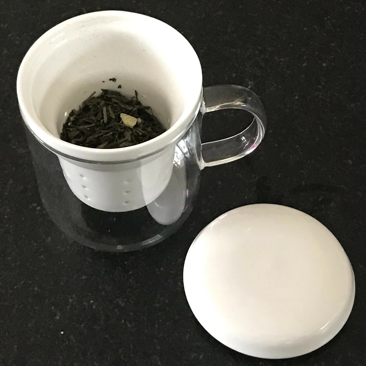 - Tasse en verre transparent, infuseur et couvercle en porcelaine,