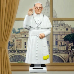 Grâce au Pape solaire, vous n’avez pas besoin d’aller au Vatican pour recevoir la bénédiction papale ! Posez le Pape solaire bienveillant et il vous donnera sa bénédiction depuis votre bibliothèque, votre bureau ou vos rebords de fenêtre. Il suffit qu’un rayon de lumière céleste l’éffleure pour qu’il fasse un signe rassurant de la main !