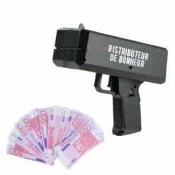 Pourquoi utiliser le Pistolet distributeur de billets ? Parce que faire voler à la main et à toute allure des billets de banque depuis une liasse est compliqué et pas très spectaculaire. Pour les grandes occasions, lors de fêtes ou autres évènements qui s’y prêtent, vous aurez désormais la possibilité d’utiliser le pour diffuser un peu de frivolité et de bonne humeur dans l’air. Remplissez le réservoir à billets avec la liasse de 75 faux billets de 500 € fournie et pressez la gâchette. Une tornade de billets va s’abattre sur votre environnement. L’appareil utilise un moteur avec une roulette en caoutchouc et juste ce qu’il faut de pression pour envoyer les billets un par un à toute allure. L’effet est spectaculaire amusant, même si les billets sont faux (si vous connaissez un moyen de le remplir facilement et rapidement avec de vrais billets, n’hésitez pas à nous envoyer un message ! ;-). L’argent ne fait pas le bonheur, mais dans ce cas, il fera au moins sourire.