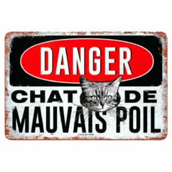 Habituellement utilisée pour prévenir de la présence d’un chien, la est ici réservée exclusivement à votre félin préféré. Cette plaque au look vintage présente un relief sur le mot « » et sur la tête de chat. L’inscription « » annonce la couleur en cas d’intrusion d’un malfrat, tout en ajoutant une pointe d’humour efficace. S’il venait l’idée subite à votre matou d’escalader le dos de vos amis à l’aide de ses griffes comme dans un arbre, personne ne pourra se plaindre qu’il n’a pas été prévenu…