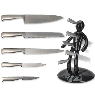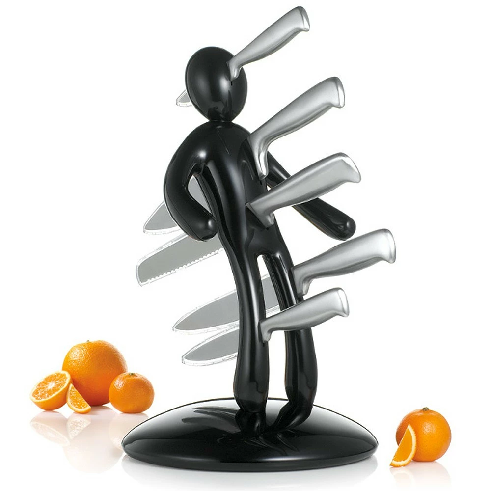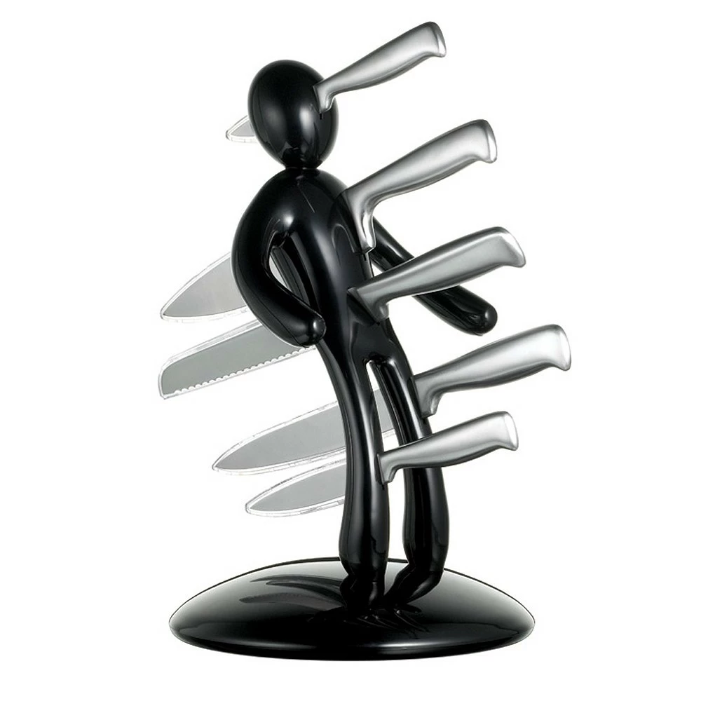 La pauvre victime est en ABS (matière plastique résistante) et comprend cinq fentes pour insérer les couteaux inclus. Les couteaux sont maintenus fermement dans le bloc par des aimants et les gaines sont aussi fournies afin de couvrir les lames de couteaux pour une sécurité supplémentaire. Un cadeau design et insolite pour la cuisine !