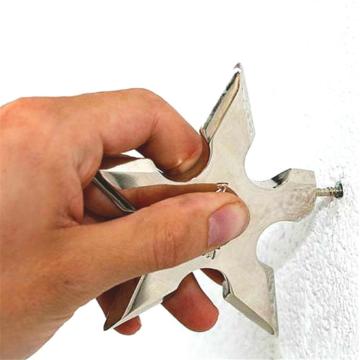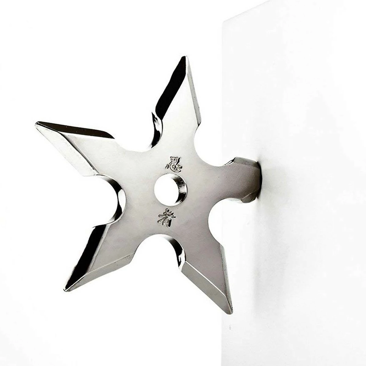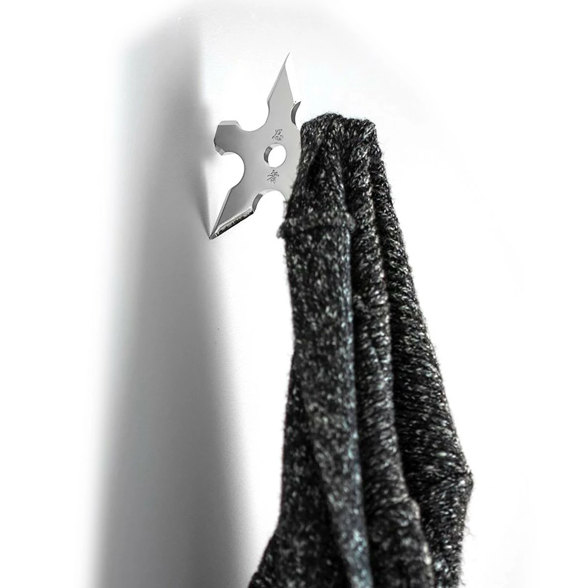 Magnifiquement ciselée dans un métal chromé étincelant, le ressemble à s’y méprendre à une vraie étoile japonaise ou Shuriken telle qu’on peut en apercevoir dans de savoureux films de Kung-fu. L’une des pointes de l’étoile est ingénieusement transformée en vis vous permettant de la fixer dans votre mur (après y avoir inséré une cheville) ou dans un porte. Plantée à l’endroit de votre choix, l’Ninja semblera avoir été projetée violemment par un ninja furieux et très costaud, tellement costaud qu’il est bien impossible d’enlever cette étoile de votre mur, il est donc logique que vous recycliez l’arme en un utile porte-manteau non ?