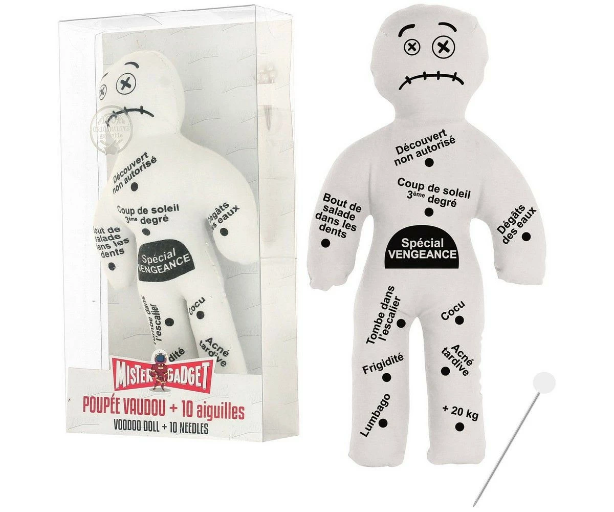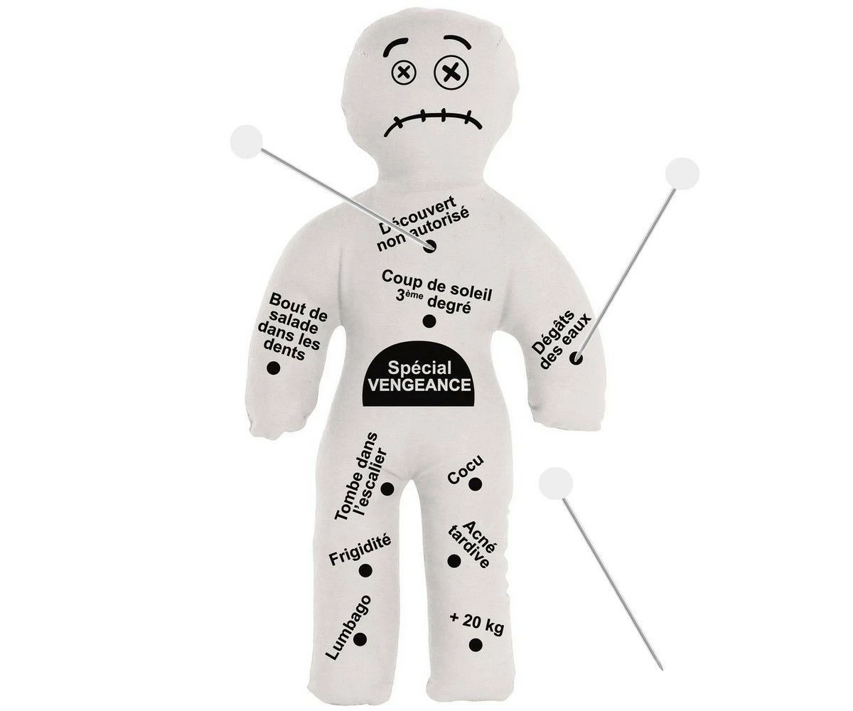 Il vous suffit de planter les aiguilles fournies là où ça fait mal pour la poupée et tellement de bien pour vous. Que diriez-vous de commencer votre vengeance par une légère prise de poids (20 kilos quand même…) ou une chute dans les escaliers ? continuez ensuite au choix par un découvert non autorisé sur fond d’acné tardive ou un lumbago sévère accompagné d’un coup de soleil au 3ème degré. Enfin, vous aurez tout loisir de conclure en rendant votre cible à la fois frigide et cocue puis victime d’un magistral dégât des eaux dans son habitat… Vous vous sentez mieux non ?