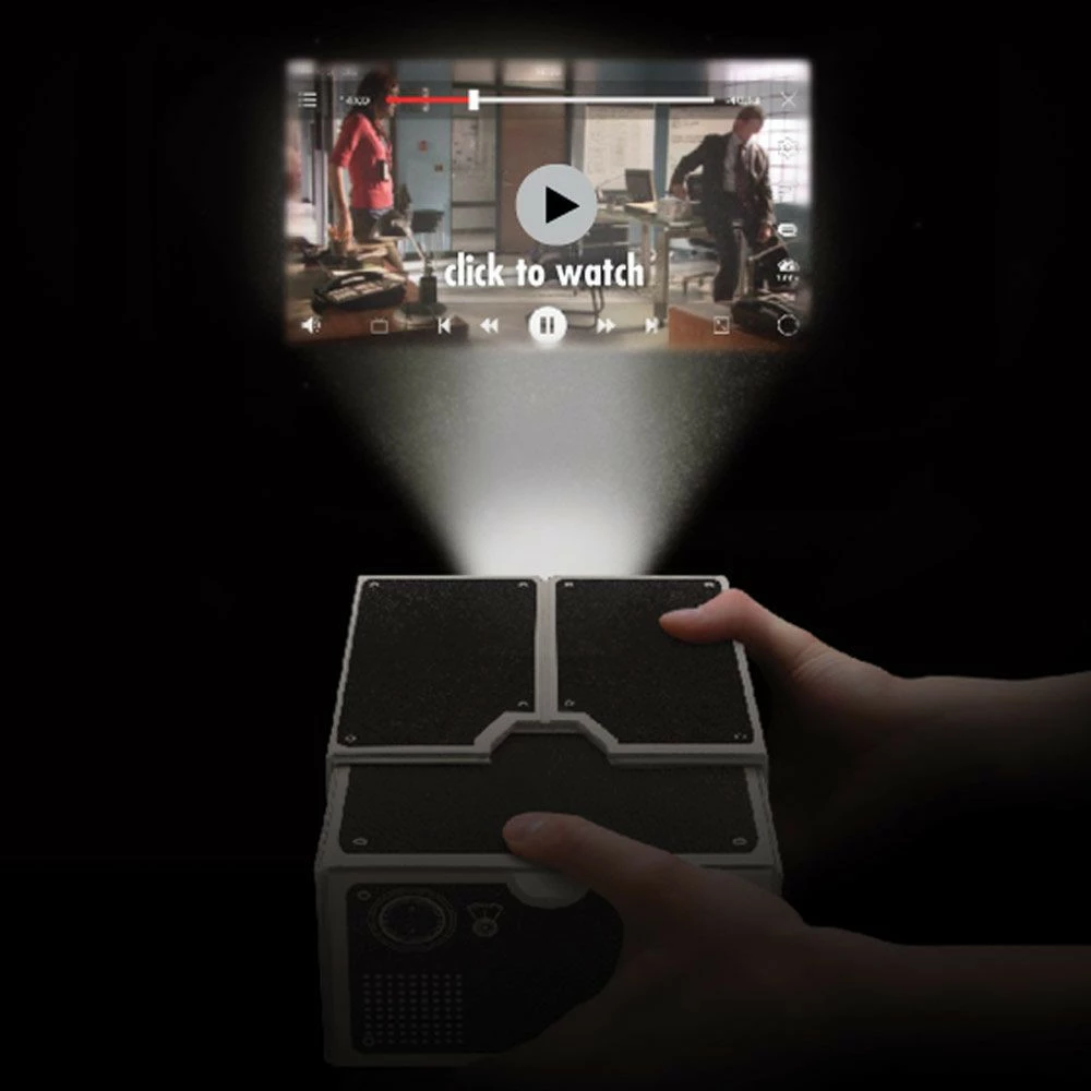Vous avez toujours voulu projeter votre vidéo préférée sur le mur pendant que vous êtes blotti dans votre lit ? Ou bien vous pensez qu’il serait cool de partager avec vos amis certaines vidéos sur votre smartphone, mais c’est impossible de tous tenir autour d’un si petit écran ? Le Projecteur pour smartphone a été conçu pour palier à ces problèmes et donc pour créer des projections « intimes » à tout moment et en tout lieu. Si vous souhaitez regarder des vidéos ou des photos avec vos amis, le Projecteur pour smartphone est la solution pour grossir votre écran et ce, jusqu’à 8 fois grâce à la lentille intégrée. Le focus se règle en ouvrant plus ou moins la boîte.