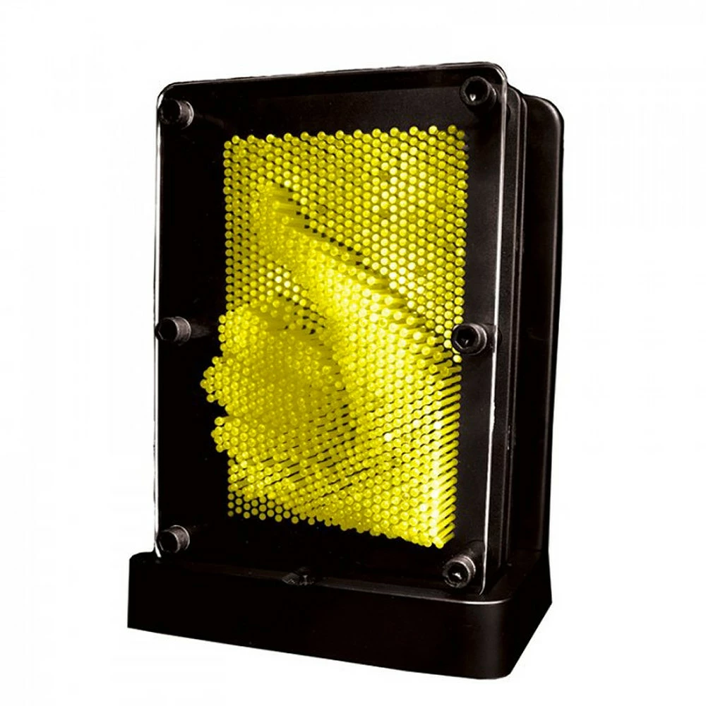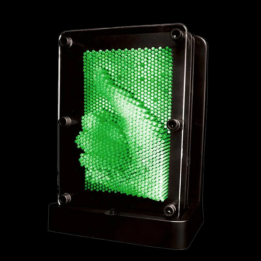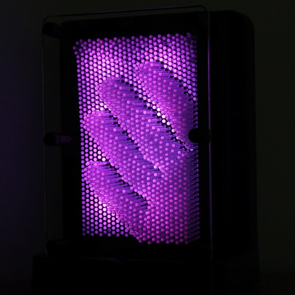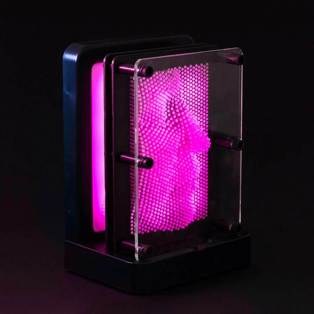 La sculpture clous 3D lumineuse a subi un cure de jouvence ! ce super gadget addictif est ! Vous pourrez désormais mettre en valeur vos sculptures les plus étonnantes avec un éclairage d’ambiance en un instant. Tout comme la sculpture clous originale, celle-ci est équipée de clous à une différence près : ils ne sont pas en métal mais en plastiques translucide qui un peu comme le fait la fibre optique. Faites votre oeuvre en collant par exemple votre visage sur les clous (sans pointes) et posez ensuite votre sculpture devant le support rétro-éclairé fourni. Miracle ! et passe progressivement par des couleurs chatoyantes violet, bleu, vert, jaune etc… Il est également possible de bloquer le changement de couleur si vous préférez une couleur fixe pour votre « oeuvre ». A la fois , votre sculpture clous n’aura jamais été autant mise en valeur ! un cadeau rétro qui aiment les objets à la fois .