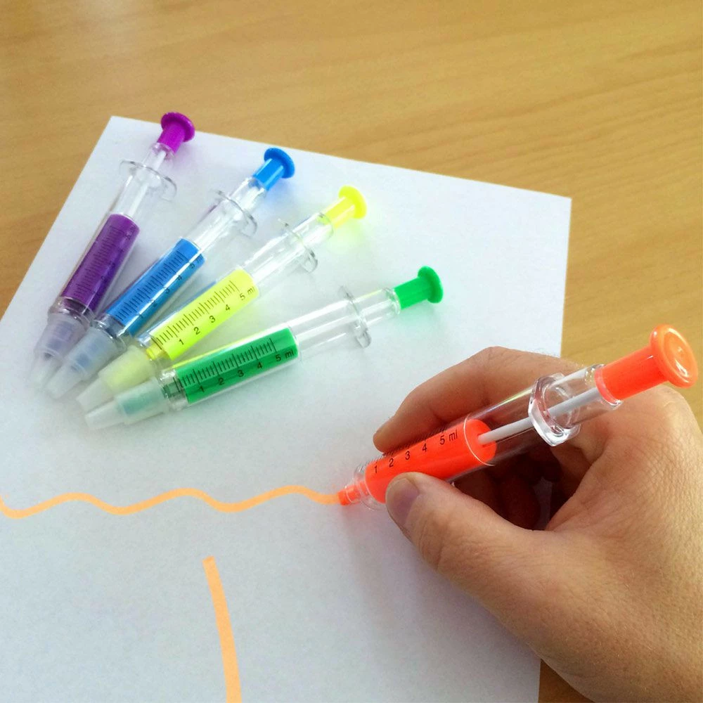 Vous cherchez un stylo utile, pratique et original pour vos notes ou pour le bureau ? Voici la Seringue stylo et surligneur. Du côté de l’aiguille se trouve un feutre surligneur fluo. De l’autre côté, un stylo à bille à l’encre bleue. Disponible en plusieurs couleurs, la Seringue stylo et surligneur complétera votre trousse à stylo, votre parure médicale ou votre collection de stylos accrochés à votre blouse blanche !