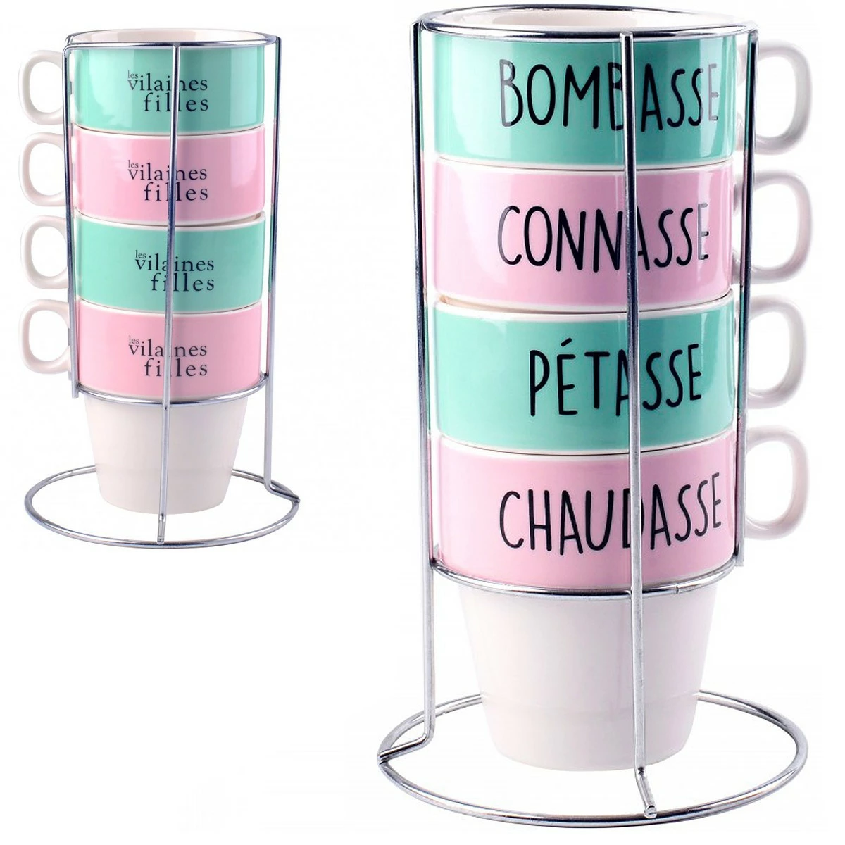 - Set de 4 tasses Vilaines Filles avec support,