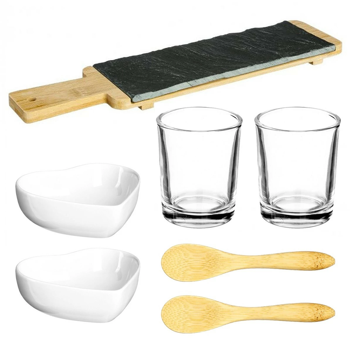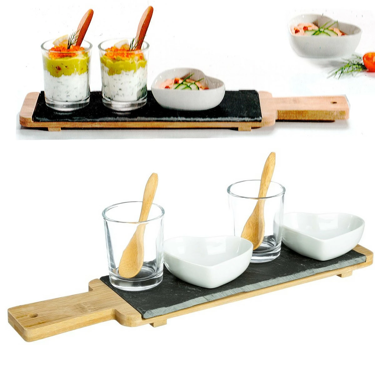 - Comprend : 1 plateau en ardoise et bambou, 2 coupelles en porcelaine, 2 verrines et 2 cuillères en bambou.