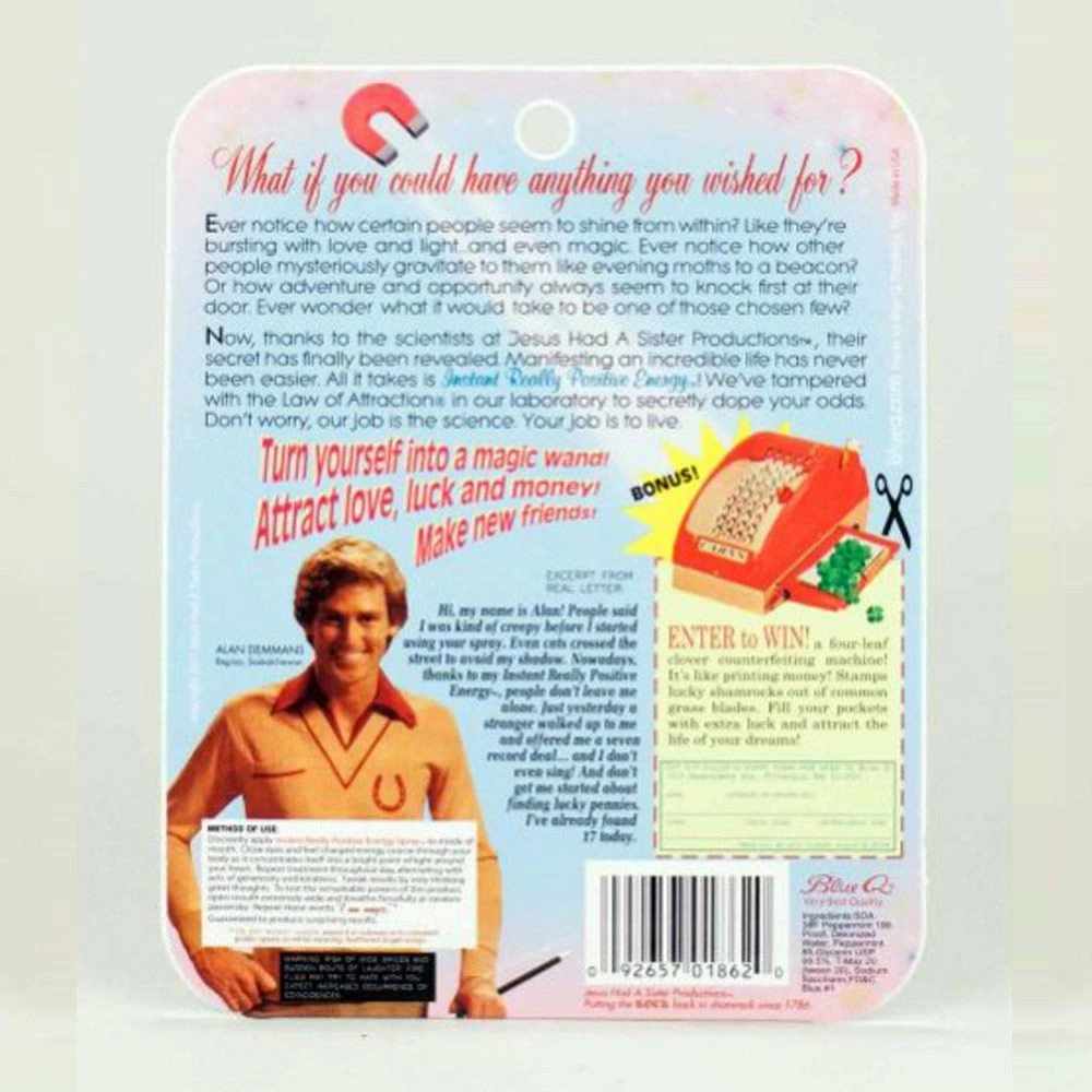Le Spray haleine énergies positives augmente instantanément votre magnétisme intérieur et des choses merveilleuses se présenteront à vous. Vous allez irrémédiablement attirer la chance, l’argent et même l’amour ! Le Spray haleine énergies positives s’utilise tous les jours dès que l’envie vous en prend. Grâce à une formule hautement secrète (il paraît qu’il y a même du vrai jus de licorne…), le Spray haleine énergies positives permet de se faire de nouveaux amis en un temps record !