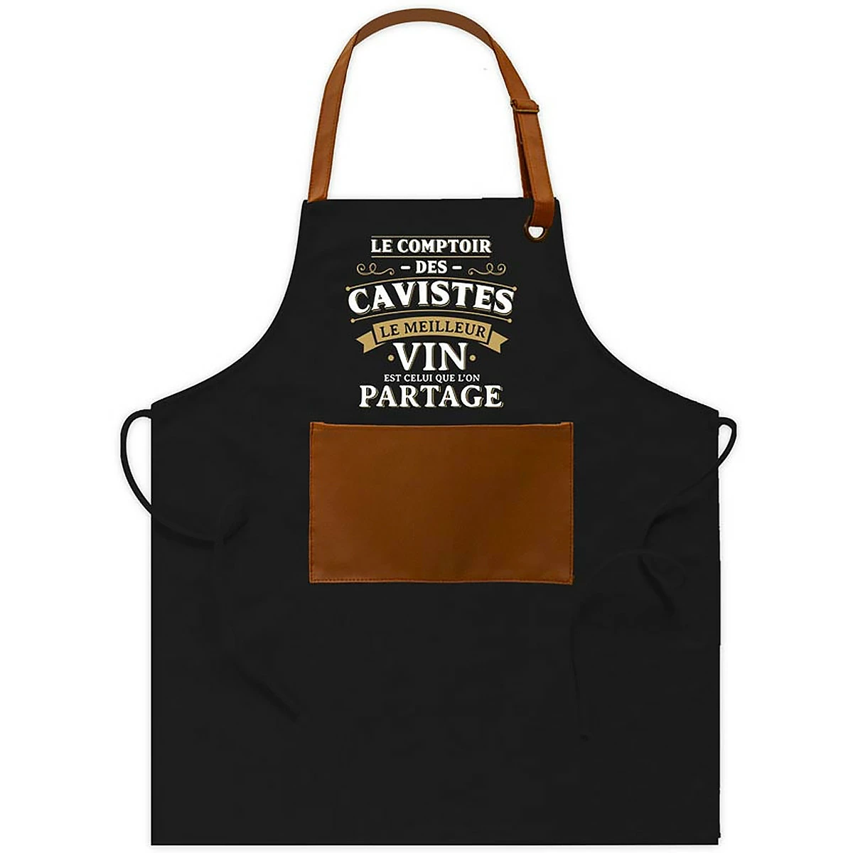 Un accessoire indispensables pour celui qui est toujours prêt à mijoter des petits plats ou à vous faire découvrir les trésors de sa cave ! Offrez-lui le Cet élégant tablier masculin est d’un noir profond avec une touche de cuir (simili cuir) pour la poche ventrale. On peut lire la mention suivante en imprimé blanc: « Le comptoir des Cavistes, le Meilleur vin est celui que l’on partage ». Ainsi équipé du , celui à qui vous l’offrirez sera fin prêt à satisfaire vos papilles et votre palais. Un cadeau utile et sympa à offrir en toute occasion pour faire un cadeau à un bon vivant : pour son anniversaire, noël ou juste pour lui faire plaisir !