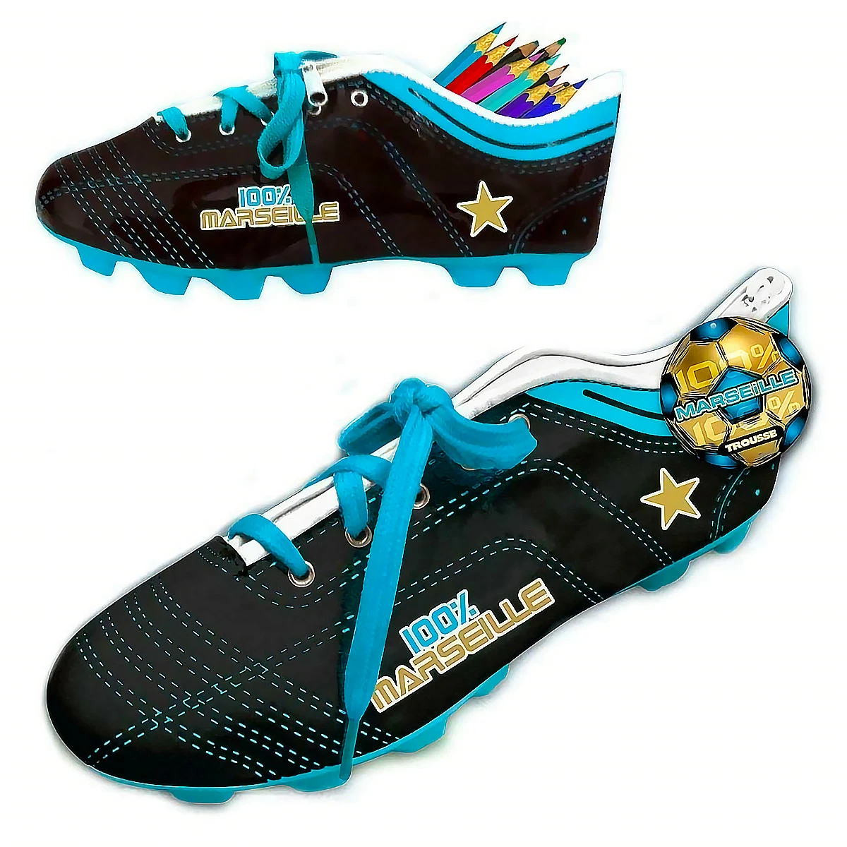 Avec cette trousse chaussure de foot aux couleurs de l’Olympique de Marseille, votre enfant va faire un carton (et pas seulement jaune) auprès de ses camarades de classe.